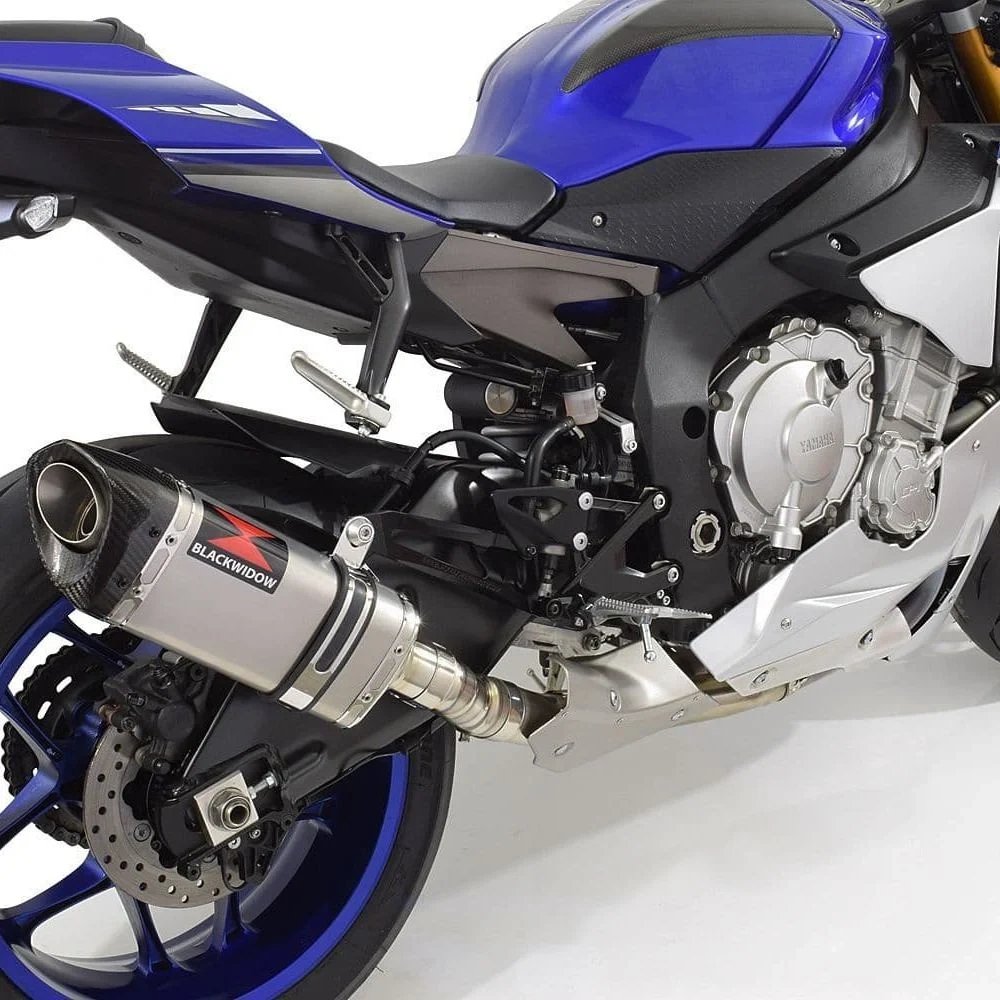 Upgrade your Yamaha YZF-R1 / R1M with this premium Black Widow exhaust system built for performance and standout styling. Constructed from high-grade black stainless steel, it offers durability with a sleek, stealth finish. The 300mm tri-oval silencer with carbon fibre tip produces a deep, sporty exhaust note with a unique tone profile. Its tri-oval design enhances both visual appeal and sound distribution for a bold road presence. Engineered for seamless fitment with OEM catalytic converters or aftermarket decat setups for flexible configurations. Complete kit includes silencer, stainless link pipe, and mounting hardware, weighing approximately 1 kg for a lightweight performance upgrade.