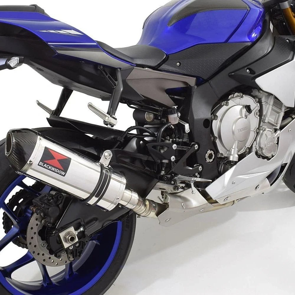 Upgrade your Yamaha YZF-R1 / R1M with this premium Black Widow exhaust system built for performance and daily usability. Constructed using high-grade 304 stainless steel, the link pipe provides strength, corrosion resistance, and reduced weight. � The 300mm oval stainless silencer with carbon fibre tip delivers a deeper, more refined exhaust note compared to shorter variants. � Designed for seamless compatibility with OEM catalytic converters or aftermarket decat systems for flexible setups. � Improves exhaust flow, throttle response, and riding comfort while keeping sound levels more controlled than 200mm systems. Complete kit includes silencer, link pipe, mounting hardware, and weighs approximately 1 kg, ensuring a lightweight upgrade.
