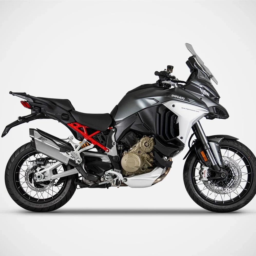 The Multistrada V4 / V4S Slip-On Exhaust (2021–2023) is a handcrafted performance upgrade engineered to enhance both touring capability and sporty riding character of Ducati’s flagship adventure machine. Constructed from high-grade titanium with stainless steel link pipe and pre-silencer, this system significantly reduces weight while improving exhaust flow efficiency. The result is smoother power delivery, better mid-range response, and a more engaging riding experience across city, highway, and long-distance touring conditions. The exhaust features a carbon fiber end cap and heat shield, adding a premium finish while maintaining durability under extreme temperatures. Its signature Zard tuning delivers a deeper, more emotional exhaust tone compared to stock, without overwhelming touring comfort. Available in homologated (road-legal) and racing versions, it allows riders to choose between everyday usability or maximum performance and sound.