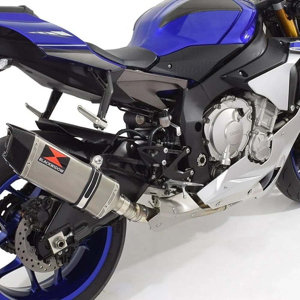Upgrade your Yamaha YZF-R1 / R1M with this Black Widow de-cat exhaust system built for performance and distinctive styling. The stainless steel de-cat collector removes factory catalytic restriction, allowing maximum exhaust flow and sharper engine response. Paired with a 300mm hexagonal stainless silencer, it produces a deep, sporty exhaust note with a unique angular design. High-grade stainless steel construction ensures durability, heat resistance, and long-term reliability under aggressive riding conditions. The carbon fibre tip enhances the visual appeal with a premium lightweight racing finish and bold road presence. Complete system includes de-cat collector, silencer, link pipe, and mounting hardware for direct fitment on 2015–2025 models.