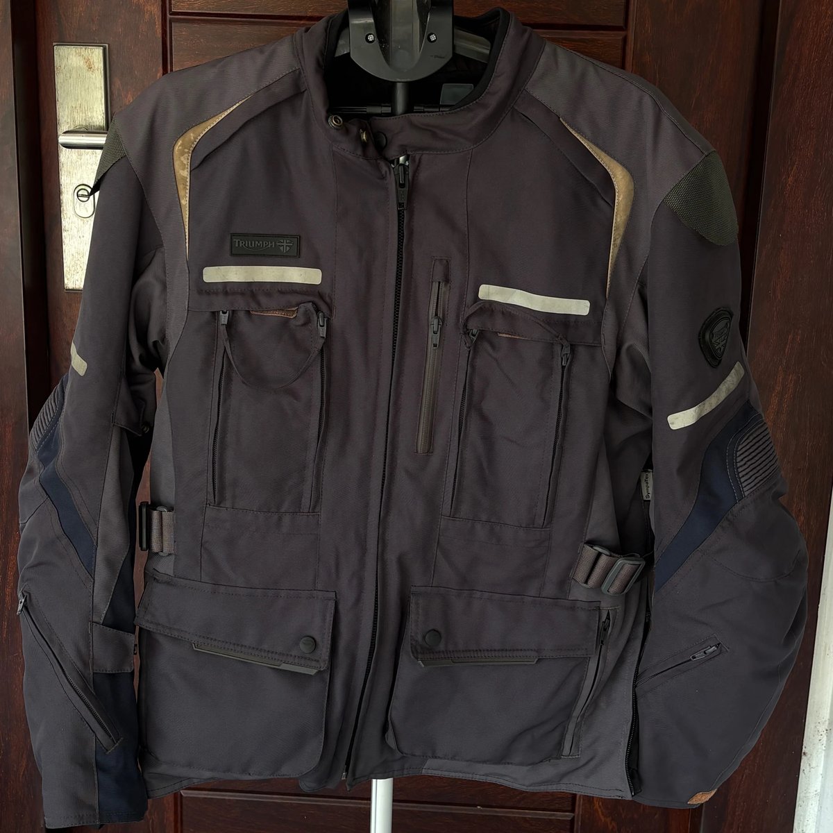 Triumph riding jacket Genuine Triumph product Size L Good condition with no damages (Aging marks are there Materials: Made from high-quality, abrasion-resistant textile fabrics. Safety: Often includes CE-certified protectors (shoulder, elbow, back) and reinforced stitching in key areas. Visibility: Features reflective detailing for enhanced visibility. Weather Protection: Many models are waterproof and breathable, designed to withstand various weather conditions.